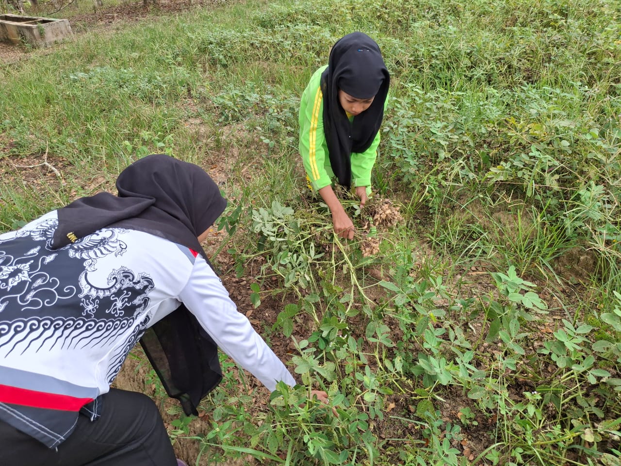 Tangan-tangan muda itu tidak takut kotor. Dengan semangat kerja keras, mereka memastikan setiap jengkal lahan terawat dengan baik. Ibu Nordiana mendampingi, memberikan arahan teknis bagaimana cara merawat perakaran kacang tanah agar polongnya berkembang maksimal.